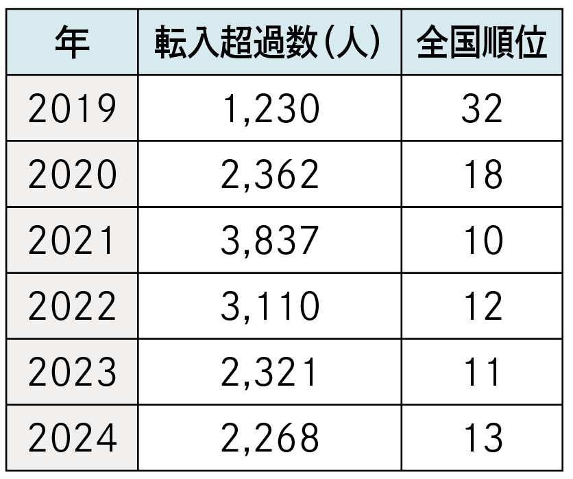 一連の施策の成果は確かな数字として表れている。2020年のシビックプライドの総合順位は78位に上昇し、その後も70位台を維持(図1)。さらに、子育て支援などが手厚い東京都に隣接しながらも近年、人口の転入超過数は全国において上位を維持している(図2)。