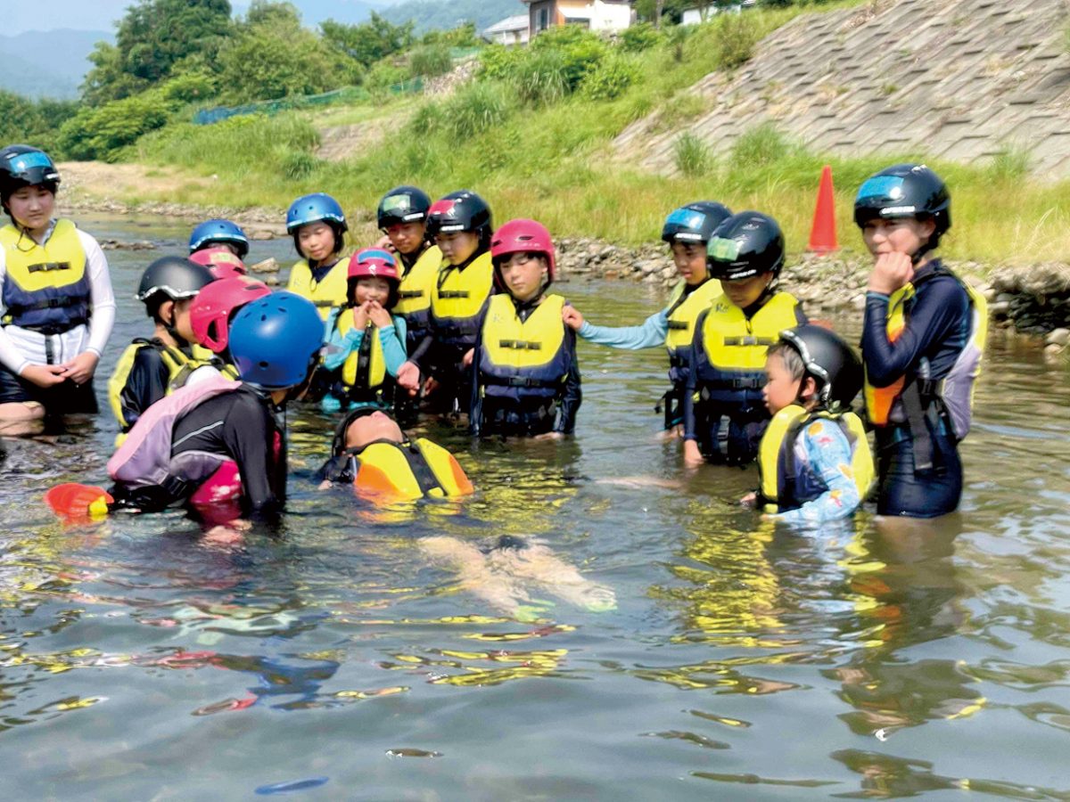 写真2 同市の小学校では地域をフィールドに五感を使う体験学習が盛ん。写真は子どもの遊び場である川での安全教室の様子。食育にも力を入れており、調理を通して地域の食文化を学び、命をいただくことへの感謝の心も育んでいる。